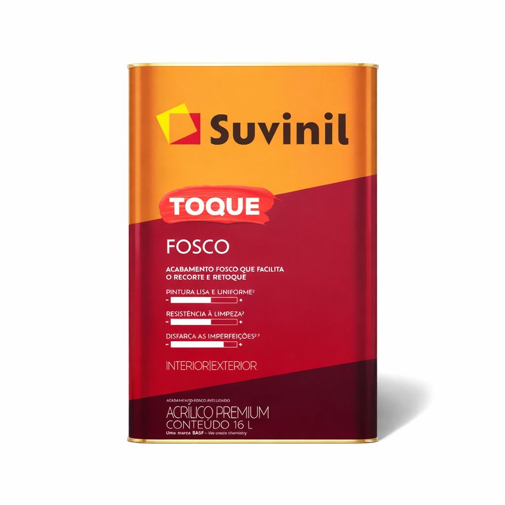 Se voce ta procurando uma tinta acrilica fosca de qualidade, com preco justo e que realmente entregue resultado, vale a pena conhecer a Toque Fosco da Suvinil. Ela tem uma formula mais sustentavel, oferece otima cobertura e alta durabilidade, ajudando a deixar a pintura bem uniforme, inclusive nos cantinhos mais chatos de pintar. O acabamento e fosco, com textura opaca, o que ajuda a disfarcar pequenas imperfeicoes da parede, como ondulacoes e fissuras, alem de deixar o ambiente mais aconchegante e elegante. Pode ser aplicada em paredes de reboco, concreto, gesso, fibrocimento, massa acrilica ou massa corrida, sendo uma opcao versatil tanto pra obra nova quanto pra reforma. E aquele tipo de tinta que resolve bem e ainda entrega um otimo custo-beneficio.