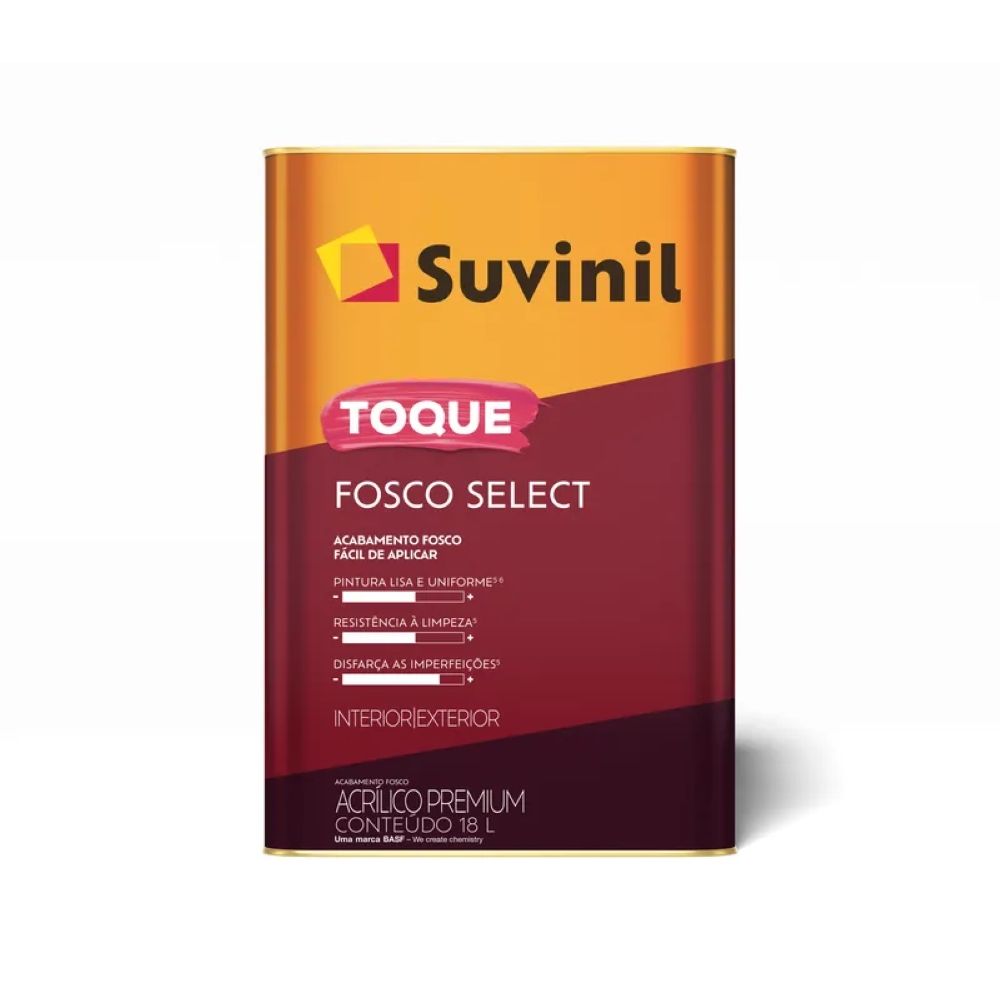 Renove ambientes internos e externos com uma tinta pratica, eficiente e de visual agradavel. O Toque Fosco Select entrega um acabamento fosco tradicional que ajuda a disfarcar pequenas imperfeicoes da superficie, com aplicacao facil e cobertura equilibrada. Ideal para quem busca um resultado bonito e funcional sem complicacao.